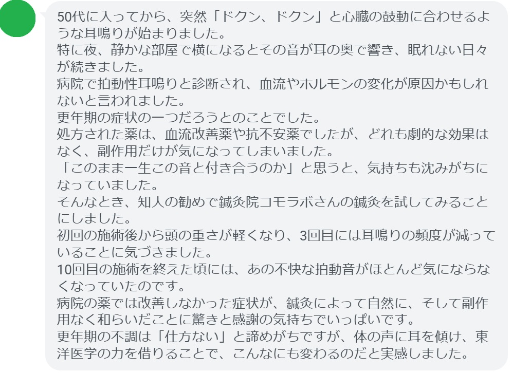 【更年期の拍動性耳鳴りが改善された方の感想(口コミレビュー)】