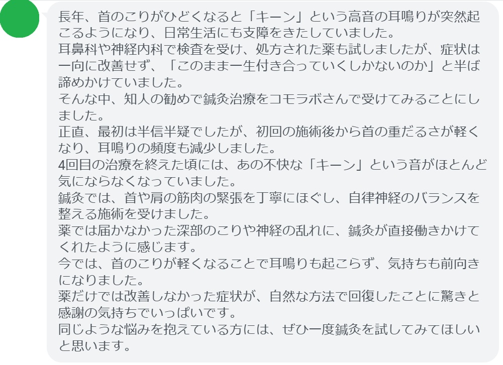 【首こりによる耳鳴りが改善された方の感想(口コミレビュー)】