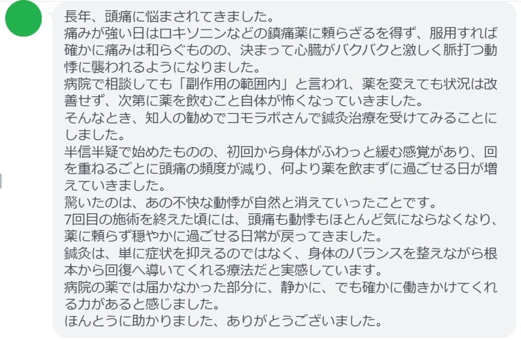 7回目の施術を終えた頃には、頭痛も動悸もほとんど気にならなくなり、薬に頼らず穏やかに過ごせる日常が戻ってきました。