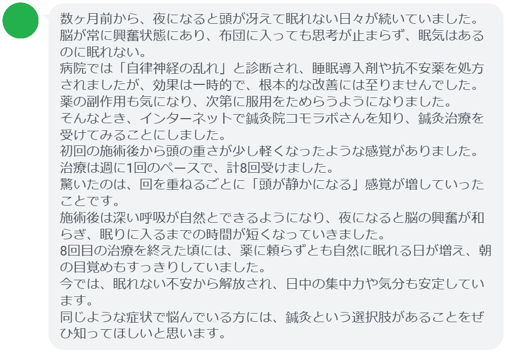 そんなとき、インターネットで鍼灸院コモラボさんを知り、鍼灸治療を受けてみることにしました。