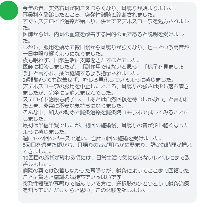 病院の薬では改善しなかった耳鳴りが、鍼灸によってここまで回復したことに驚きと感謝の気持ちでいっぱいです。