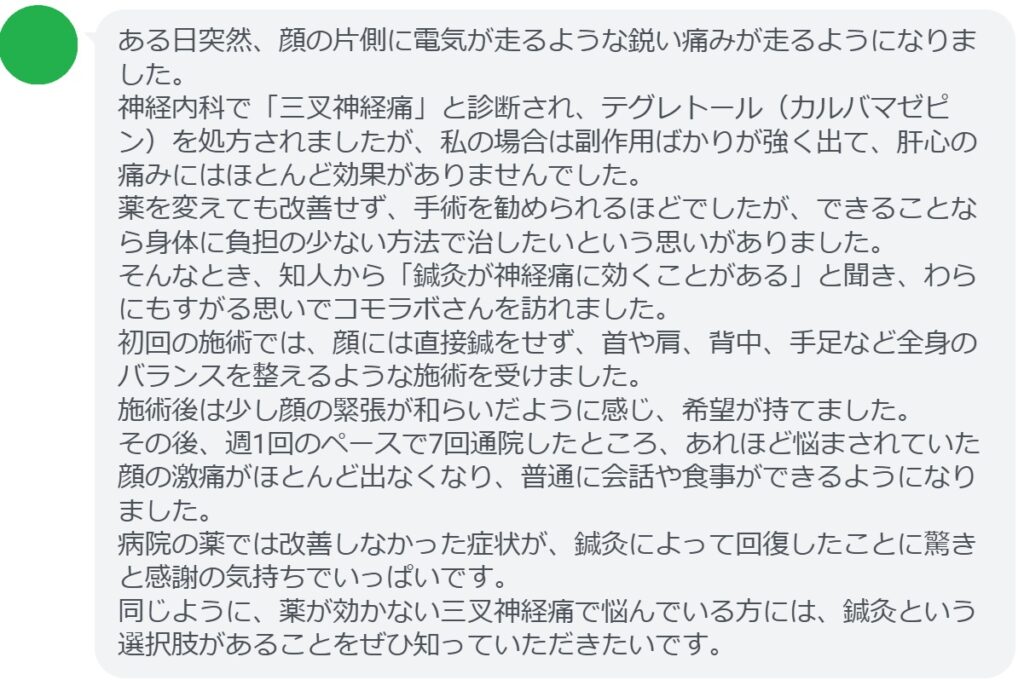 そんなとき、知人から「鍼灸が神経痛に効くことがある」と聞き、わらにもすがる思いでコモラボさんを訪れました。