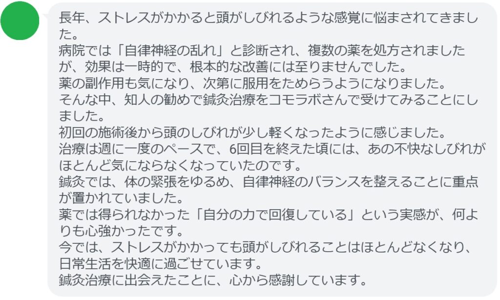 初回の施術後から頭のしびれが少し軽くなったように感じました。