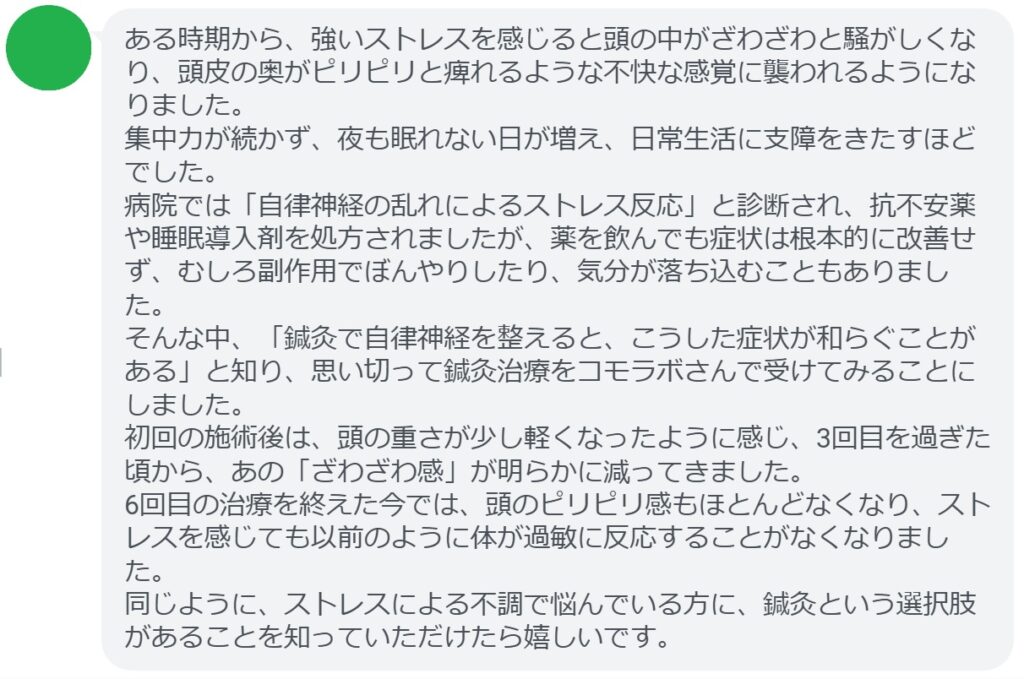 6回目の治療を終えた今では、頭のピリピリ感もほとんどなくなり、ストレスを感じても以前のように体が過敏に反応することがなくなりました。