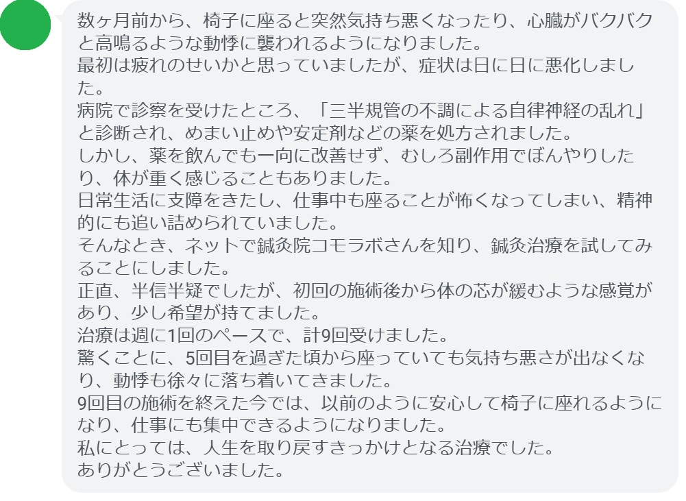【椅子に座ると動悸する症状が改善された方の感想(口コミレビュー)】
