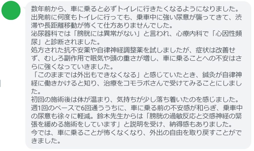 「このままでは外出もできなくなる」と感じていたとき、鍼灸が自律神経に働きかけると知り、治療をコモラボさんで受けてみることにしました。初回の施術後は体が温まり、気持ちが少し落ち着いたのを感じました。