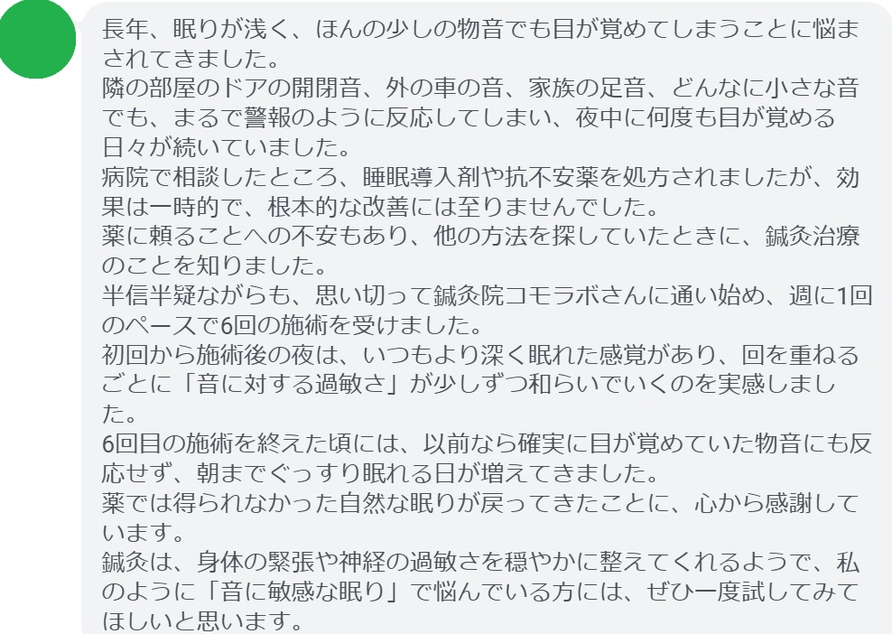 初回から施術後の夜は、いつもより深く眠れた感覚があり、回を重ねるごとに「音に対する過敏さ」が少しずつ和らいでいくのを実感しました。