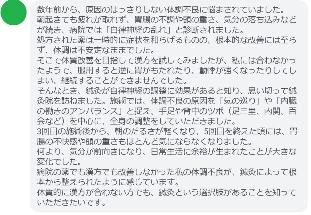 病院の薬でも漢方でも改善しなかった私の体調不良が、鍼灸によって根本から整えられたように感じています。