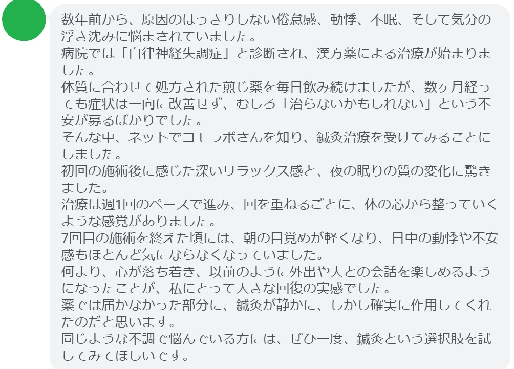 そんな中、ネットでコモラボさんを知り、鍼灸治療を受けてみることにしました。