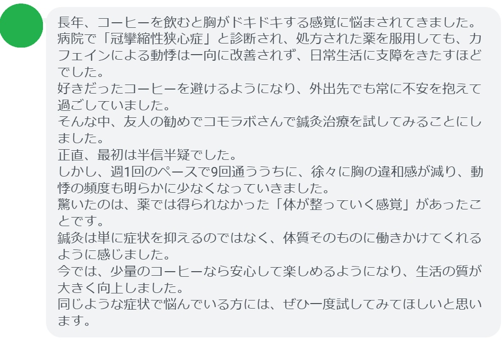 【冠攣縮性狭心症による動悸が改善された方の感想(口コミレビュー)】