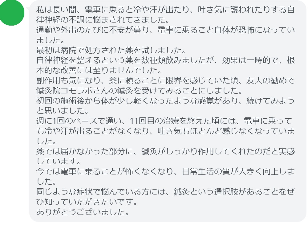 【電車に乗ると冷や汗と吐き気が改善された方の感想(口コミレビュー)】