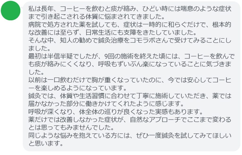 最初は半信半疑でしたが、9回の施術を終えた頃には、コーヒーを飲んでも痰が絡みにくくなり、呼吸もずいぶん楽になっていることに気づきました。