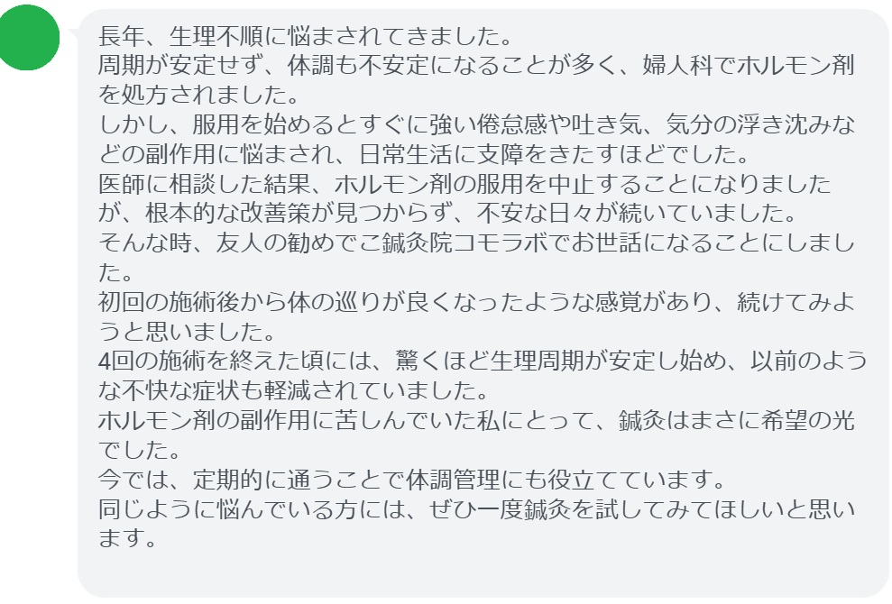 4回の施術を終えた頃には、驚くほど生理周期が安定し始め、以前のような不快な症状も軽減されていました。