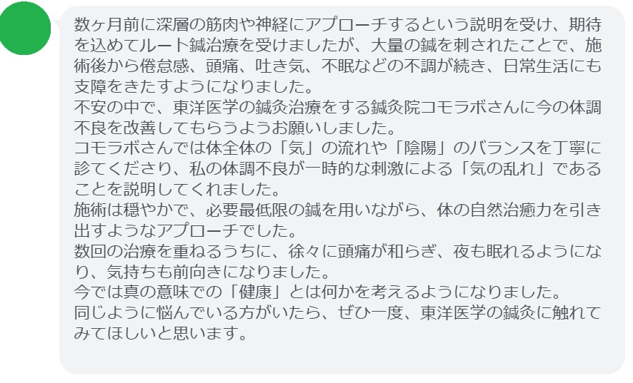 数ヶ月前に深層の筋肉や神経にアプローチするという説明を受け、期待を込めてルート鍼治療を受けましたが、大量の鍼を刺されたことで、施術後から倦怠感、頭痛、吐き気、不眠などの不調が続き、日常生活にも支障をきたすようになりました。