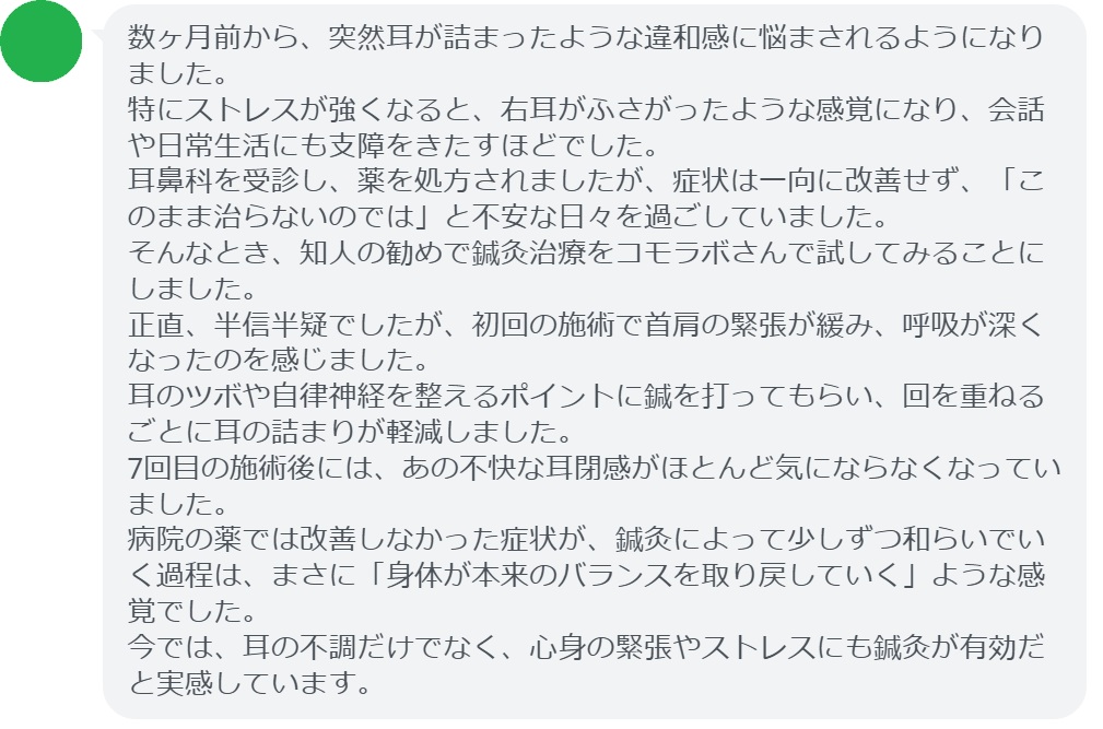耳のツボや自律神経を整えるポイントに鍼を打ってもらい、回を重ねるごとに耳の詰まりが軽減しました。