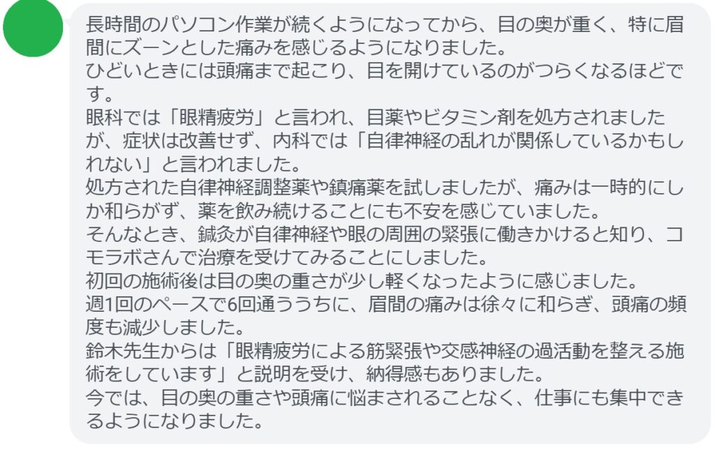 【眼精疲労による眉間の痛みが改善された方の感想(口コミレビュー)】