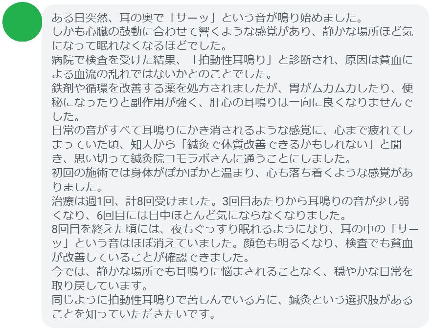 同じように拍動性耳鳴りで苦しんでいる方に、鍼灸という選択肢があることを知っていただきたいです。
