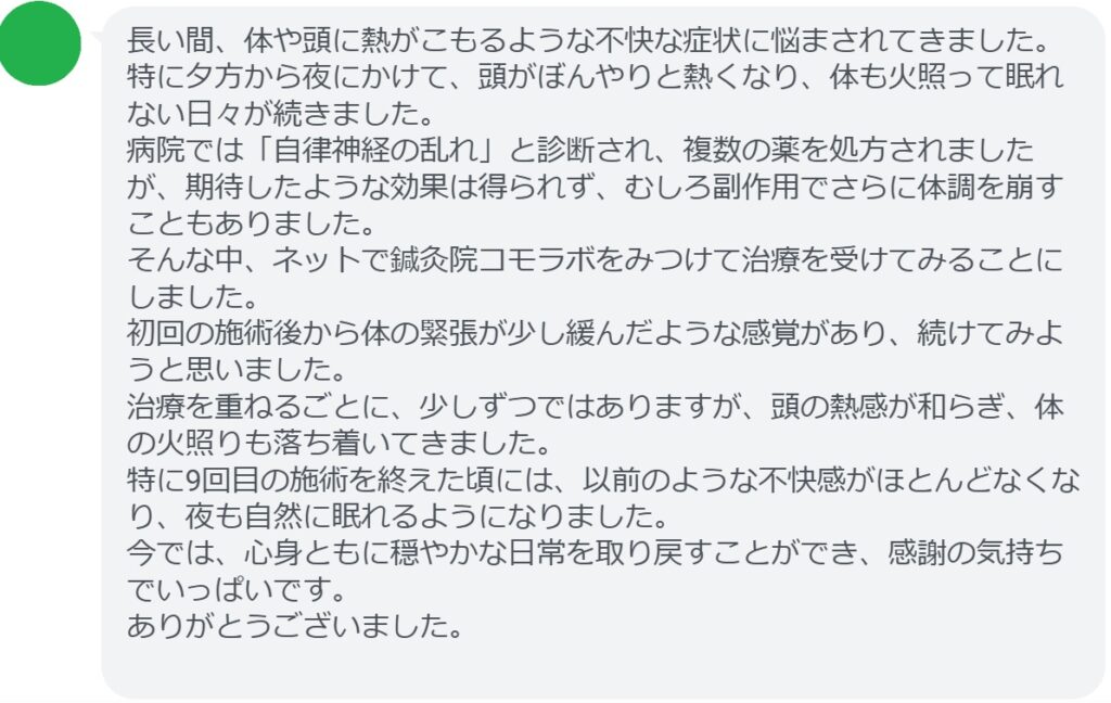 治療を重ねるごとに、少しずつではありますが、頭の熱感が和らぎ、体の火照りも落ち着いてきました。