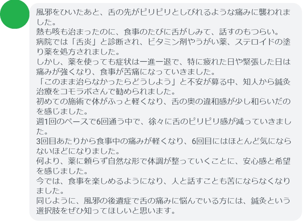 同じように、風邪の後遺症で舌の痛みに悩んでいる方には、鍼灸という選択肢をぜひ知ってほしいと思います。