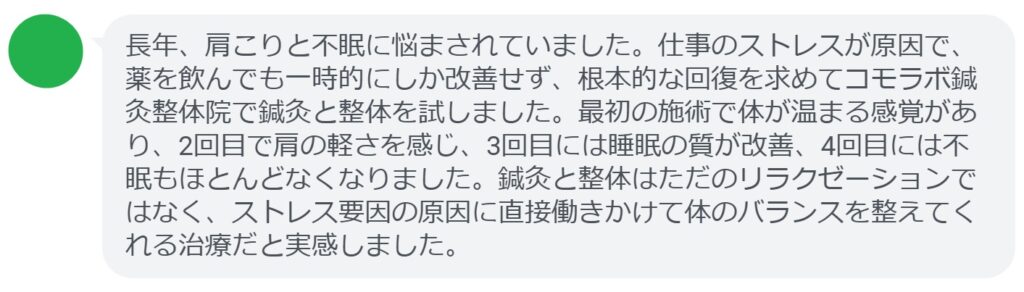 「長年、夜中に何度も目が覚める不眠と日中のだるさに悩んでいました。生活習慣を見直しても改善が乏しく、鍼灸を試すことに。週1回、計6回の施術でまず寝つきが良くなり、夜間の覚醒が減りました。ほてりも徐々に落ち着き、朝のだるさが軽くなったのを実感しています。施術中のリラックス感と、家でできるセルフケアの指導が特に役立ちました。薬に頼らず体のリズムを整えられたことが何より嬉しいです。」