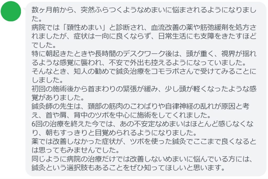 【頚性めまいが改善された方の感想(口コミレビュー)】